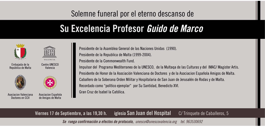 En la Iglesia de San Juan del Hospital de Valencia, se celebró el viernes, el funeral por el eterno descanso de Su Excelencia Prof. Guido de Marco presidente de la Asamblea General de Naciones Unidas (1990) y de la República de Malta (1999-2004).